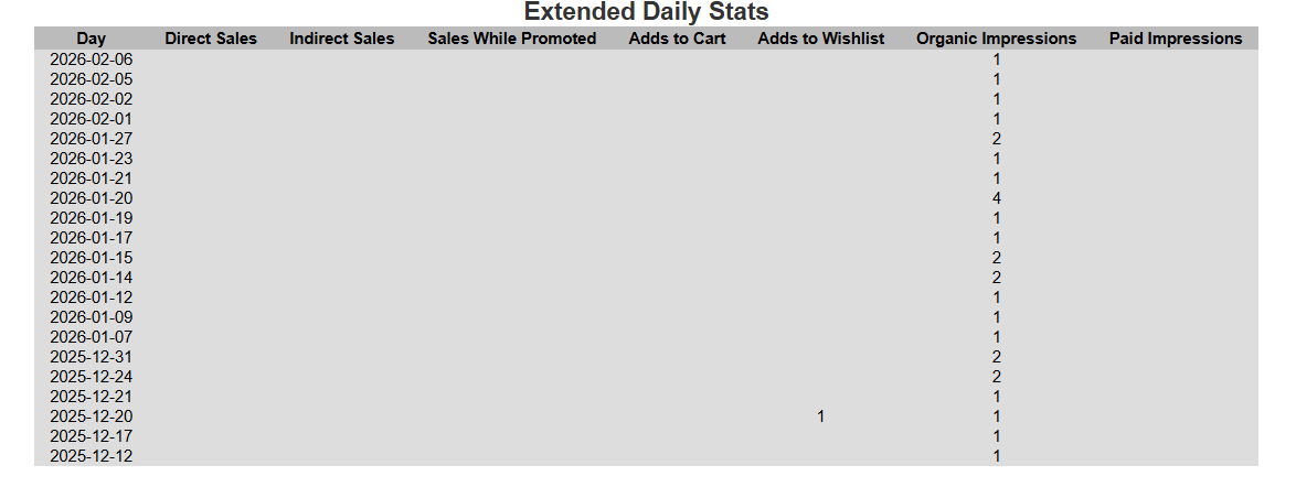 • In your product list, selecting show extended stats will display lifetime* totals for each product. • Lifetime* stats include data back to mid November 2025. • Clicking into an individual product will show per-day stats for any date where data exists, starting December 12.