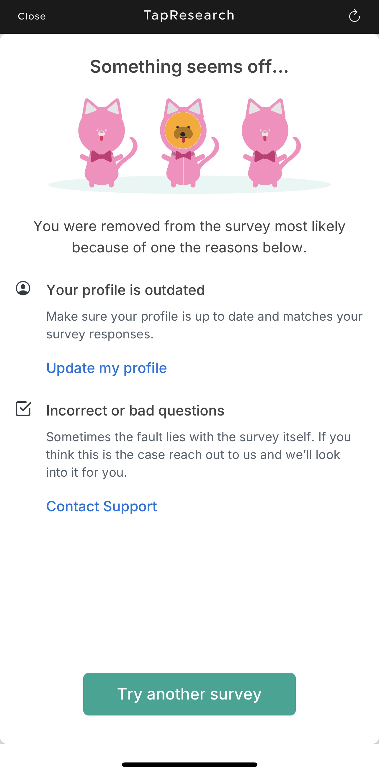 Hi I’m wondering why my surveys never work when I click everything right ! Maybe get better survey company’s.